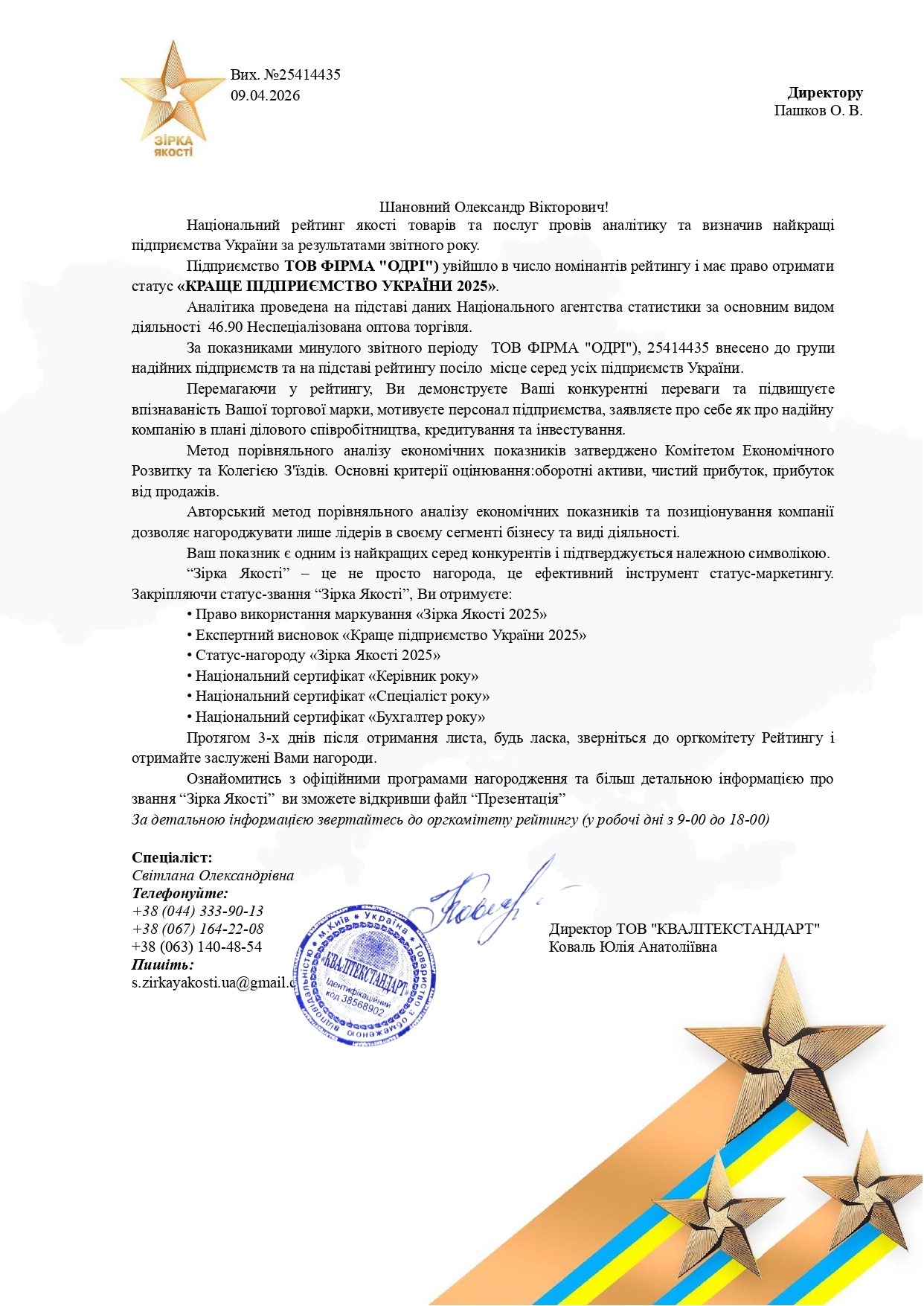 Національний рейтинг якості товарів та послуг підбив підсумки роботи українських підприємств за минулий звітний період. За результатами комплексної аналітики ТОВ ФІРМА "ОДРІ" увійшло до числа номінантів престижного рейтингу та отримало право на присвоєння статусу «КРАЩЕ ПІДПРИЄМСТВО УКРАЇНИ 2025».